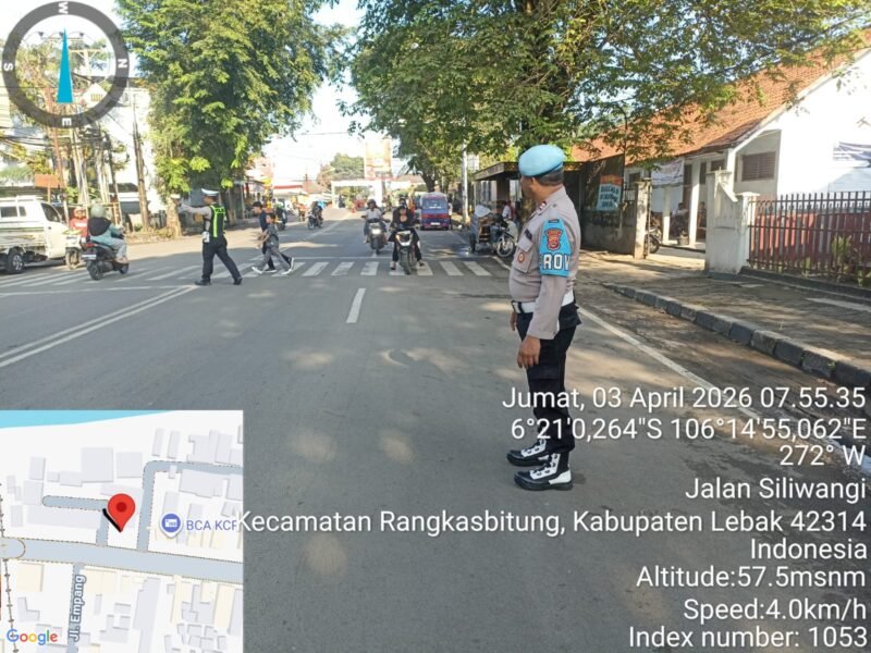 Lebak,Pilarfakta.id,-Anggota Polsek Rangkasbitung Polres Lebak , melaksanakan giat gatur lalin depan gereja Pasundan sekligis sebrangkan jemaat gereja yang akan melaksnakan ibadah diacara kenaikan isa almasih dengan tema Kasih Putih di Gereja Pasundan.