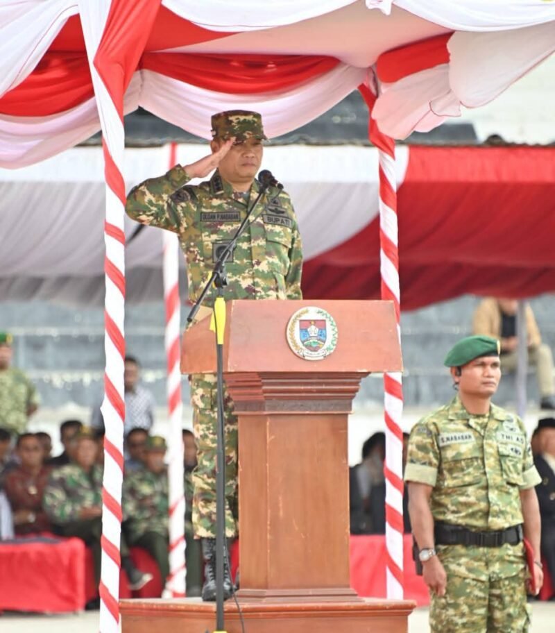 Doloksanggul, Pilarfakta.id. -Bupati Humbang Hasundutan Dr. Oloan Paniaran Nababan, SH. MH bertindak sebagai inspektur upacara Penyambutan prajurit Batalyon Infanteri Teritorial Pembangunan (Yonif TP) 955/Hoda Sihapaspili di markas sementara yang berada di Stadion Simangaronsang, Kecamatan Doloksanggul, Sabtu 14 Maret 2026.