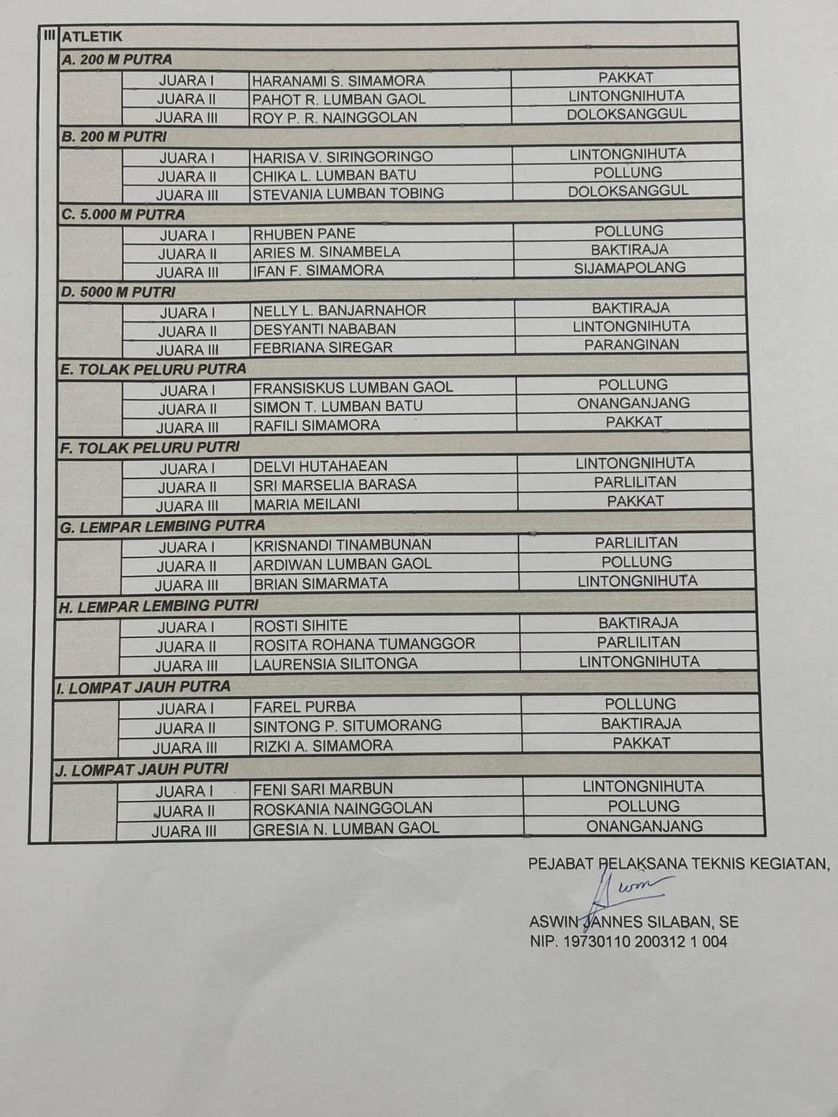 Adapun hasil dari pertandingan antara lain: (terlampir dalam foto)