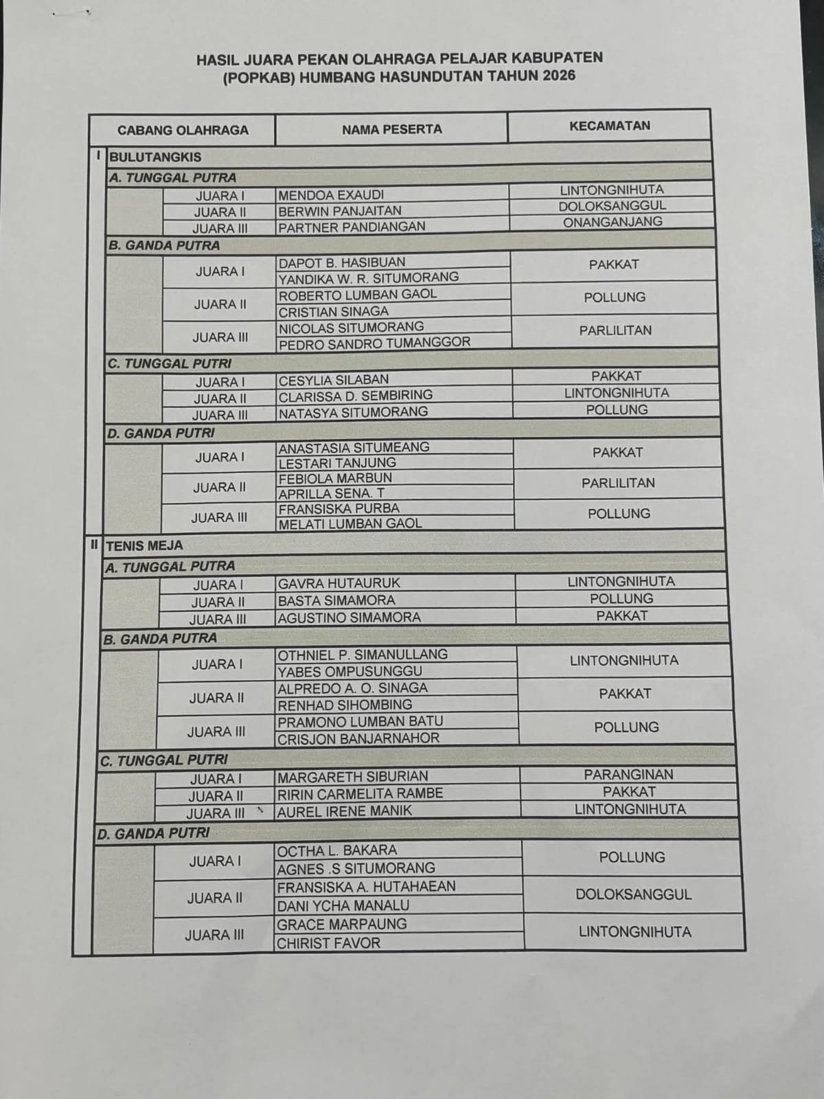 Sementara itu dalam laporannya Kadis Parpora Dina Simamora menyampaikan bahwa POPKAB Humbang Hasundutan Tahun 2026 ini dilaksanakan mulai tanggal 30 Maret s/d 1 April 2026 dengan jadwal 30 Maret 2026 dilaksanakan Final Cabang Atletik, 31 Maret 2026 dilaksanakan Babak penyisihan Cabang Bulu Tangkis dan Tenis Meja dan 1 April 2026 dilaksanakan perebutan juara 3 dan Final Cabang Bulu Tangkis dan Tenis Meja.