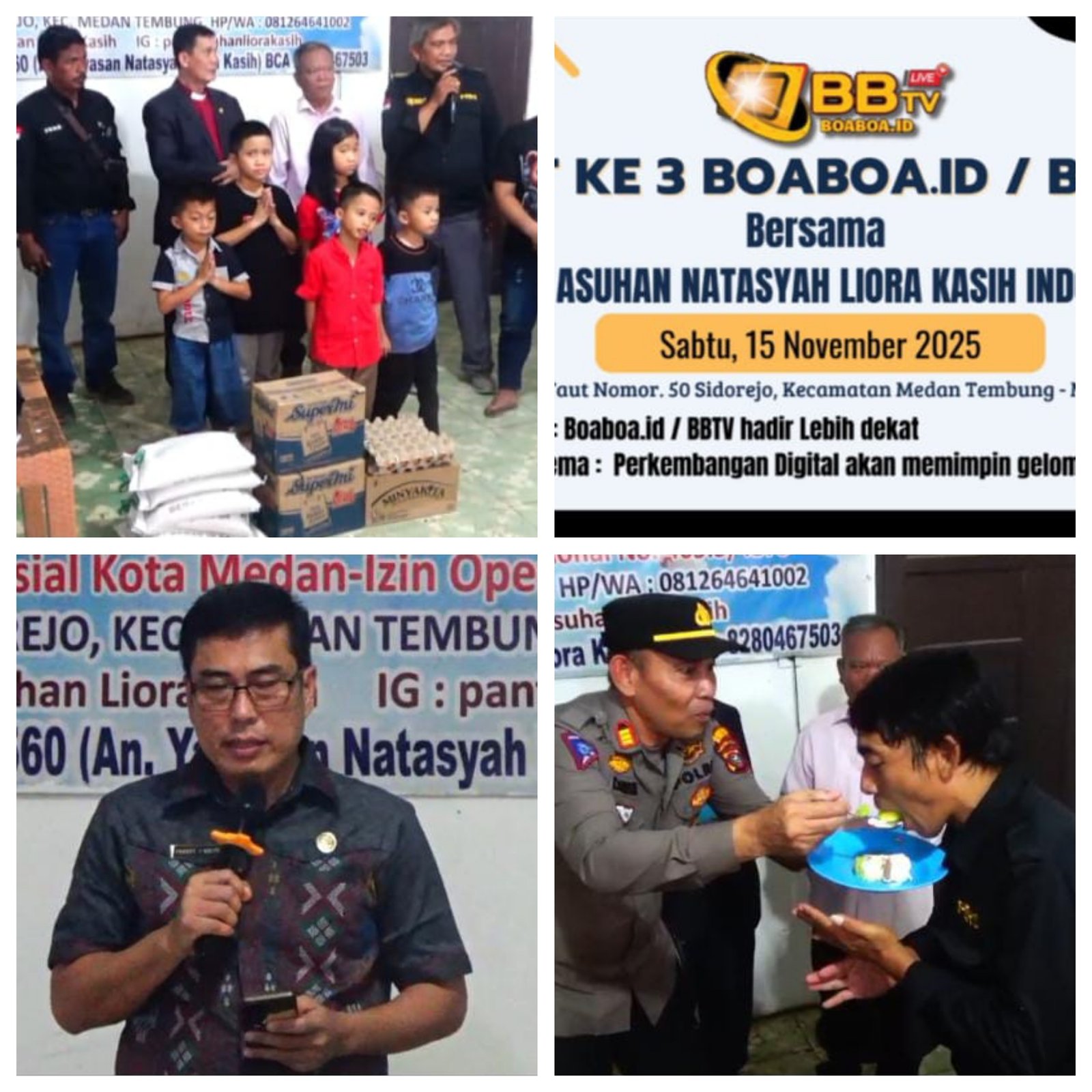 Medan – Perayaan Hari jadi ketiga tahun Media boaboa.id / BBTV 16/11/25 , berjalan sukses dan meriah. Perayaan ulang tahun Boaboa.id / BBTV ini dilaksanakan secara sederhana di Panti Asuhan Natasya Liora Kasih Indonesia yang ada di Jl. Taud Nomor 50 Sidorejo Kecamatan Medan Tembung.