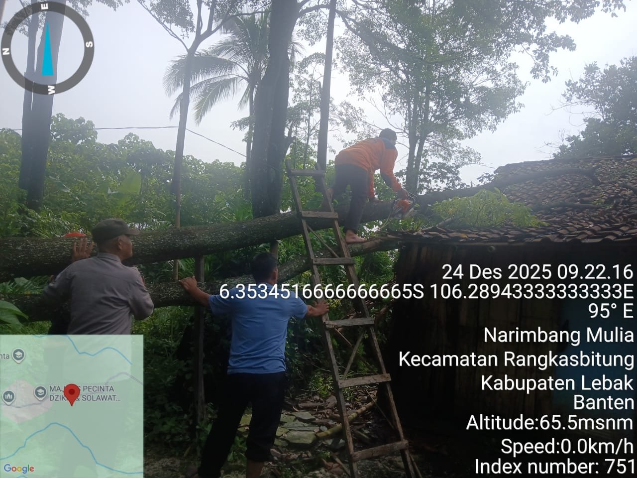 Bersama dinas BPBD Kabupaten Lebak hadir untuk membantu membersihkan pohon tumbang yang menimpa rumah warga atas nama Pardi di kampung Ancol, RT.12, RW 04,Desa Cimangeunteung, Kecamatan Rangkasbitung.Rabu (24/12/2025)