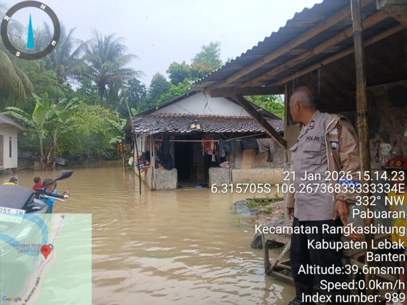 PilarFakta.id-Kanit Binmas Polsek Rangkasbitung Polres Lebak,AIPTU Heru Sasmito, melaksanakan giat pengecekan rumah warga yang terendam air, akibat meluapnya sungai Ciujung di Desa Pabuaran,Kecamatan Rangkasbitung,Kabupaten Lebak.