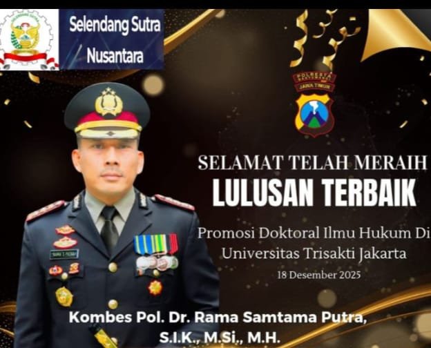 BANYUWANGI – pilar fakta id – Prestasi akademik membanggakan kembali ditorehkan oleh jajaran Kepolisian Republik Indonesia. Kombes Pol. Dr. Rama Samtama Putra, S.I.K., M.Si., M.H., berhasil meraih predikat Lulusan Terbaik dalam Promosi Doktor Ilmu Hukum di Universitas Trisakti Jakarta, yang dilaksanakan pada 18 Desember 2025.