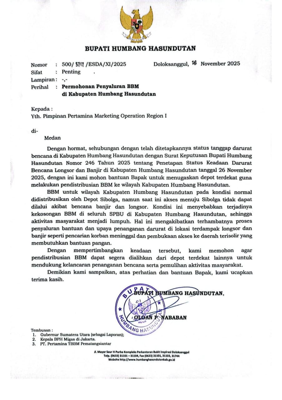 DOLOKSANGGUL, -Bupati Humbang Hasundutan Dr Oloan Paniaran Nababan SH MH sudah mengajukan permohonan tambahan pasokan BBM (Bahan Bakar Minyak) kepada Pimpinan Pertamina Marketing Operation Regional I untuk kebutuhan pasca bencana alam yang melanda wilayah Kabupaten Humbang Hasundutan. Surat permohonan itu telah disampaikan Bupati Humbang Hasundutan, Minggu 28 November 2025 lalu.