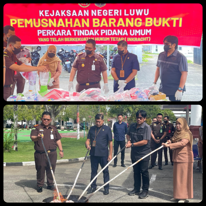 Sulsel – Pemusnahan dipimpin langsung oleh Kepala Kejaksaan Negeri Luwu, Muhandas Ulimen, S.H., M.H. didampingi oleh Plh Seksi Perampasan Aset dan Barang Bukti (PAPBB), Hamka Dahlan S.H., serta para Kepala Seksi/Kasubagbin, Kasubsi, Jaksa Fungsional, dan staff Kejaksaan Negeri Luwu.