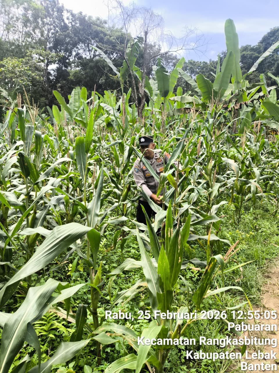 LEBAK,pilarfakta.id,- Memastikan proses perkembangan tanaman pohon Jagung dalam program ketahanan pangan, Bhabinkamtibmas Polsek Rangkasbitung AIPDA Juremi, melaksanakan kegiatan peninjauan serta monitoring pertumbuhan bibit jagung unggul.