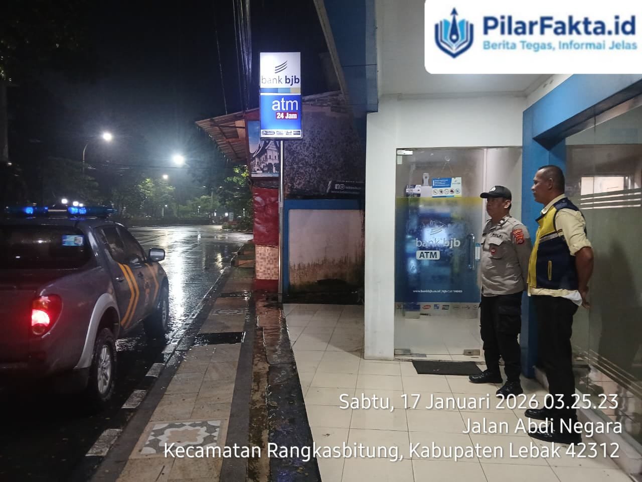 LEBAK,Banten.PilarFakta.id-KSPKT I Polsek Rangkasbitung Polres Lebak AIPTU Deni.S dan AIPTU Terry.MS, melaksanakan giat patroli ke Bank BJB di Jalan Abdi Negara Rangkasbitung.Kelurahan Rangkasbitung Barat, Kecamatan Rangkasbitung,Kabupaten Lebak.Sabtu pagi 17 Januari 2026,pukul.03.25 Wib.