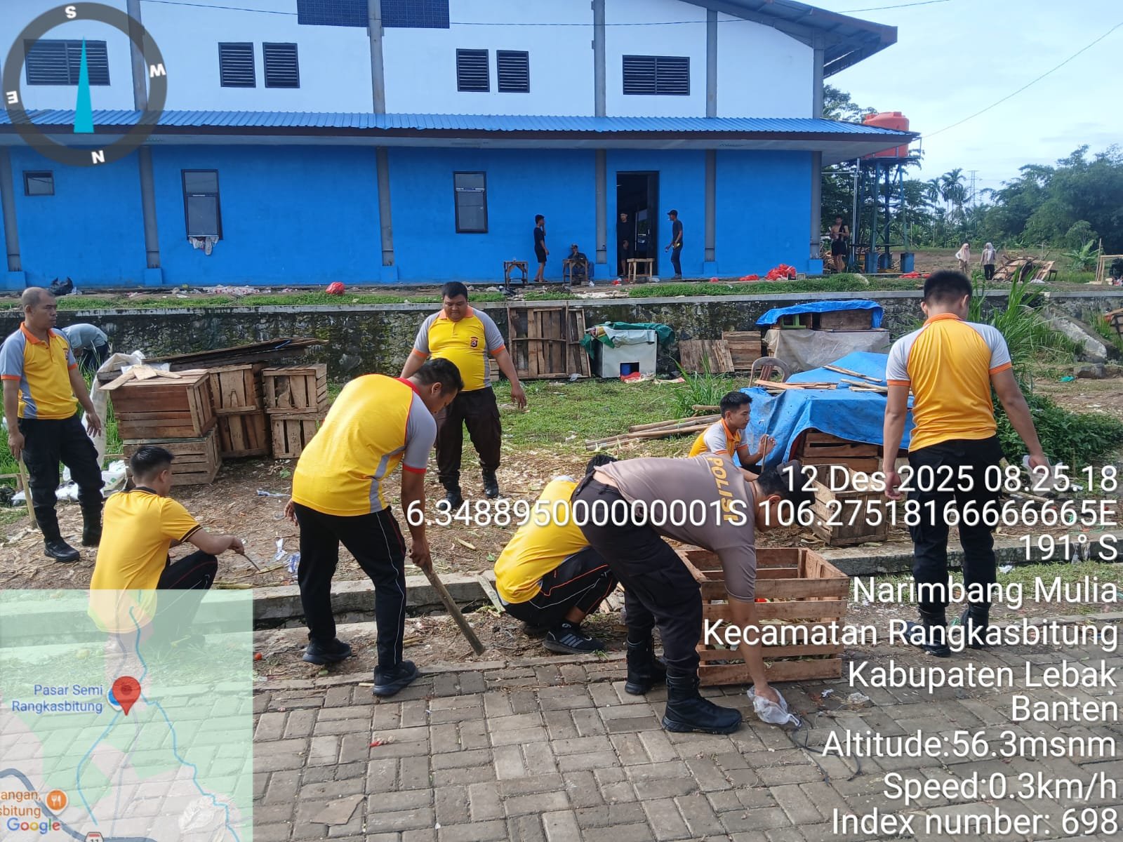 LEBAK,PilarFakta.id-Sejumlah personel kepolisian bersama TNI dan masyarakat kompak membersihkan sampah di area seputaran pasar tradisional,Kecamatan Rangkasbitung,Kabupaten Lebak.(12/12/2025).