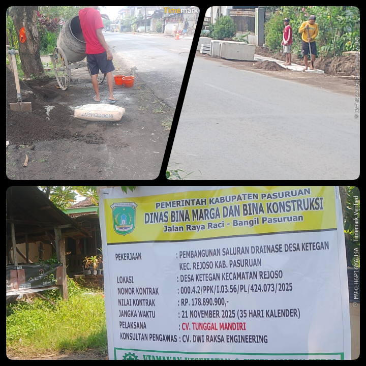 Pembangunan jalan paving baru lebar 3 m dan saluran Drainase di desa ketegan kecamatan rejoso dengan nomor kontarak 000.4.2/ppk1.03.56/pl/424.073/2025 dengan anggaran dana sebesar RP 178.955.700,00 yang dikerjakan oleh CV TUNGGAL MANDIRI terkesan tidak transparan dan diduga proyek tertutup memberikan informasi publik. Karena dua kali ke lokasi hanya terlihat tukang dan beberapa kuli yang sedang bekerja .