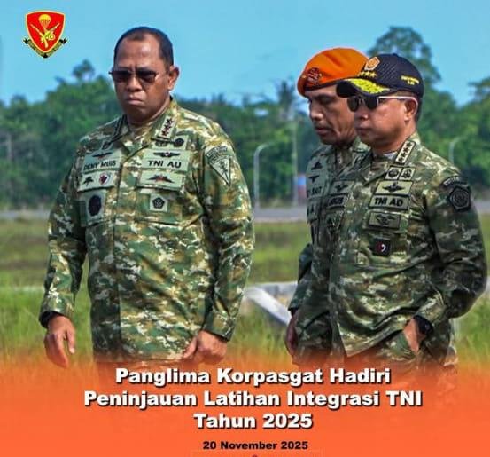 MOROWALI, — Dalam rangka memperkuat pengamanan sumber daya alam (SDA) strategis nasional, Panglima Korpasgat Marsdya TNI Deny Muis, S.E., M.M., menghadiri peninjauan Latihan Integrasi TNI Tahun 2025 yang dipusatkan di kawasan bandara PT. Indonesia Morowali Industrial Park (IMIP), Morowali, Sulawesi Tengah, Kamis (20/11/2025).
