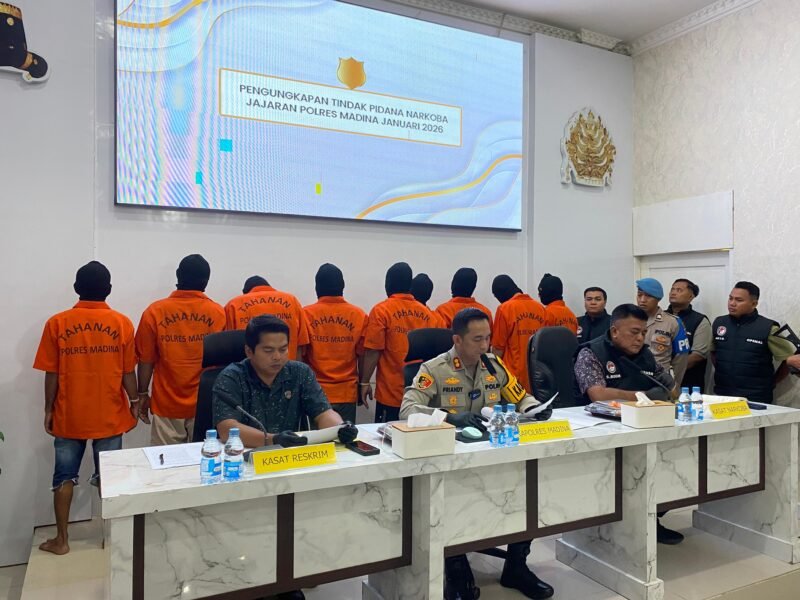 Madina, pilarfakta,id polres Mandailing Natal menggelar press release hasil penindakan kasus narkotika selama bulan Januari 2026. Dalam kurun waktu satu bulan, aparat kepolisian berhasil mengungkap 13 kasus dengan total 18 tersangka yang diamankan.