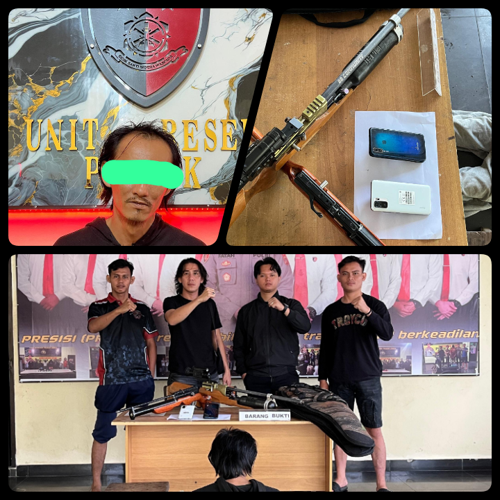 Barang bukti yang diamankan meliputi 2 unit handphone, 2 pucuk senapan angin gas, 1 sarung tas senapan dan 1 kursi kayu