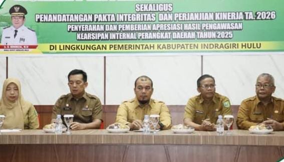 INHU ,pilarfakta.id – Bupati Indragiri Hulu (Inhu) Ade Agus Hartanto, S.Sos., M.Si resmi menyerahkan Dokumen Pelaksanaan Anggaran (DPA) Tahun Anggaran 2026 di Gedung Sejuta Sungkai, Rengat, Senin (09/02/2026). Agenda ini disejalankan dengan penandatanganan Pakta Integritas dan Perjanjian Kinerja 2026 serta penyerahan apresiasi hasil pengawasan kearsipan internal perangkat daerah tahun 2025.