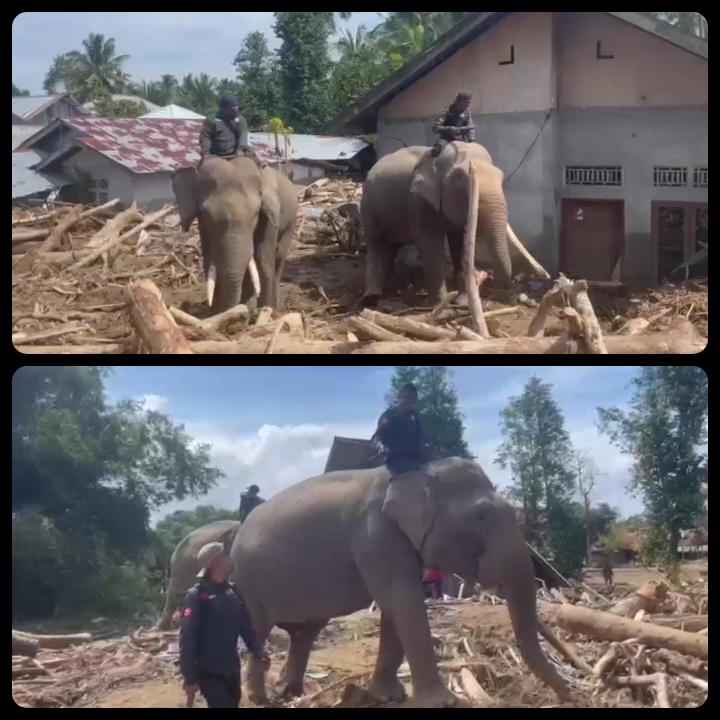 “Empat gajah yang kita datangkan bersama BKSDA Aceh hari ini sudah berada di lokasi. Mereka langsung kita kerahkan untuk menarik kayu-kayu besar serta material berat lainnya yang menumpuk akibat banjir,” ujar Iptu Fauzi.
