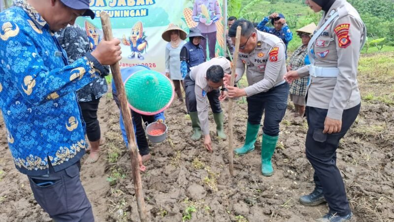 Kuningan,.pilarfakta.id, Tugas polisi lalu lintas (polantas) tidak melulu soal mengatur arus kendaraan di jalan raya. Jajaran Satuan Lalu Lintas (Satlantas) Polres Kuningan membuktikan peran sosialnya dengan terjun langsung ke sawah, menanam jagung di lahan seluas 2 hektare di Desa Cibulan, Kecamatan Cidahu, Kamis (29/1/2026).