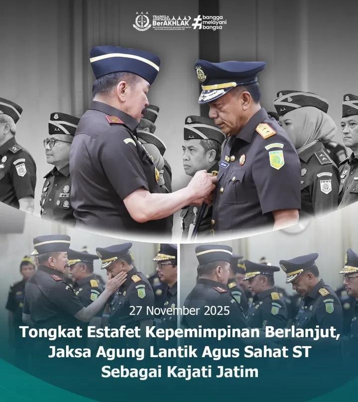 Jakarta – Jaksa Agung Republik Indonesia, ST Burhanuddin, secara resmi melantik Agus Sahat Sampe Tua Lumban Gaol, S.H., M.H., sebagai Kepala Kejaksaan Tinggi Jawa Timur. Prosesi pelantikan berlangsung dengan khidmat di Aula Gedung Utama Kejaksaan Agung, Kamis (27/11/2025).