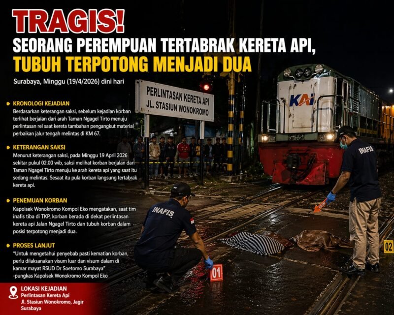 Surabaya -Pilarfakta.id.-Seorang perempuan tanpa identitas tewas tertabrak kereta api dengan tubuh terpotong menjadi dua bagian di perlintasan Jalan Stasiun Wonokromo, Jagir, Minggu (19/4/2026) dini hari.