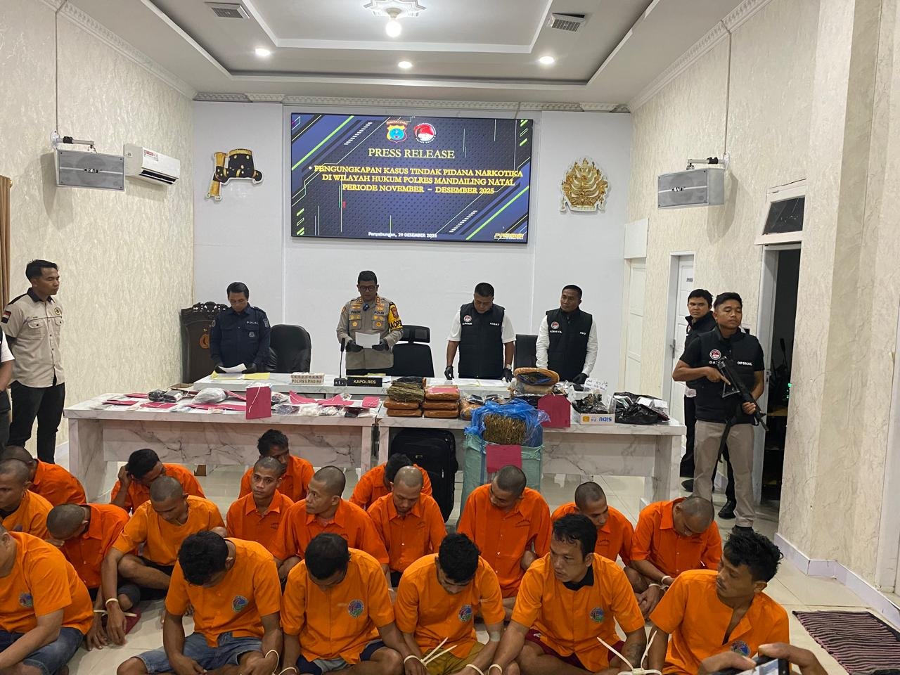 Kepolisian Resor (Polres) Mandailing Natal menggelar konferensi pers terkait pengungkapan kasus tindak pidana narkotika selama periode November hingga Desember 2025. Kegiatan tersebut dilaksanakan pada Senin (29/12/2025) di Mapolres Mandailing Natal.