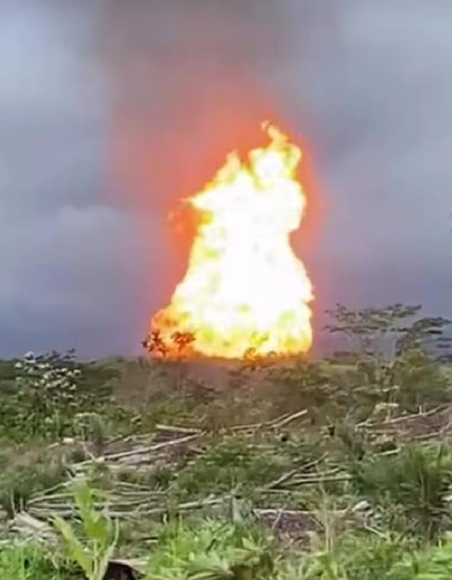 Api kemudian menyembur dari lokasi pipa dengan ketinggian diperkirakan mencapai puluhan meter dan hingga sore hari masih terlihat menyala, disertai semburan gas.